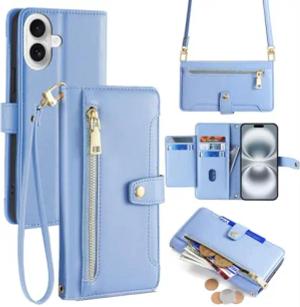 Hülle Kompatibel mit Apple iPhone 16 Plus | Leder Handyhülle Praktische Handykette Kartenfächer Brieftasche Umhängetasche Kompatibel für iPhone 16 Plus | Hellblau