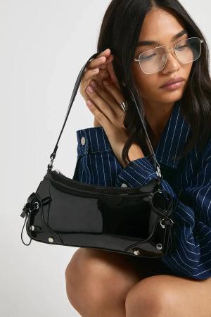 Womens Bow Detail Vinyl Shoulder Bag - Black - One Size, Black