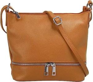 Umhängetasche Echt Leder Damen Made in Italy, verstellbarer Schultergurt, Handtasche mit Reißverschlüssen, verstärkter Boden cognac 020960