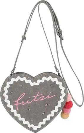 Fritzi Herzli Cross Wiesn Jack Pepper Crossbody Tasche Lederoptik Herz-Design Wellenkordel Damen Umhängetasche Oktoberfest mit Pompon-Anhänger 22 x 16 x 6 cm, Grau