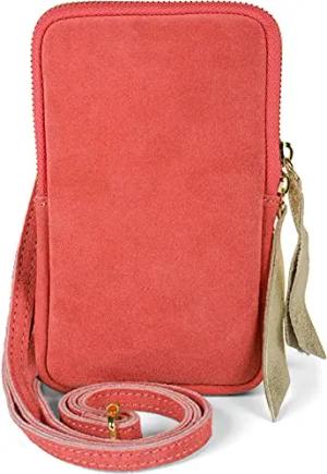 Damen Leder Handy Umhängetasche aus weichem Veloursleder, Reißverschluss, Echtleder Mini Bag 02012373, Farbe:Koralle