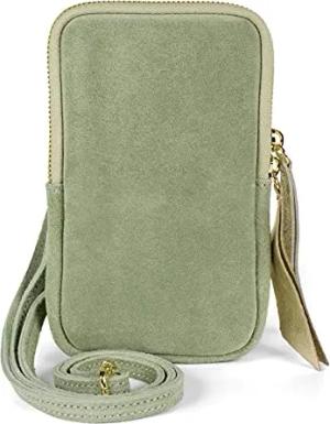 Damen Leder Handy Umhängetasche aus weichem Veloursleder, Reißverschluss, Echtleder Mini Bag 02012373, Farbe:Lindgrün