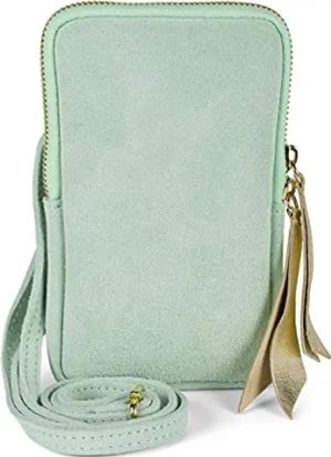 Damen Leder Handy Umhängetasche aus weichem Veloursleder, Reißverschluss, Echtleder Mini Bag 02012373, Farbe:Mint