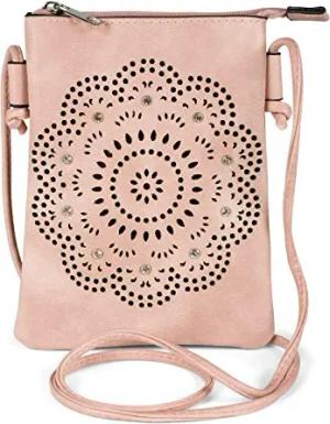 Damen Mini Umhängetasche mit Blumen Lasercut Cutout Muster und Strass | kleine Crossbody Bag Schultertasche Handytasche 14,5 x 19 cm, Farbe:Altrosa