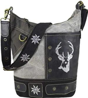 Damen Trachtentasche. Umhängetasche mit Hirsch & Edelweiß Aufdruck. Graue Crossover Bag in Vintage- Retro Stil. Vegane Schultertasche oder Crossbody Tasche