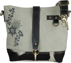 Damen Trachtentasche. Umhängetasche mit Edelweiß & Hopfenzweig Aufdruck. Graue Crossover Bag in Trachten Vintage- Retro Stil.