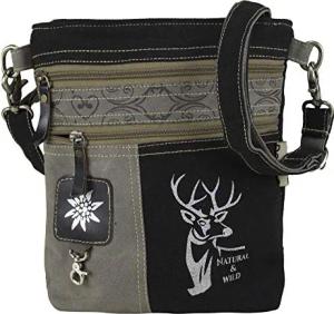 Trachtentasche. Canvas Umhängetasche. Oktoberfest Damen Crossbody Bag mit Hirsch/Edelweiss Aufdruck. Geschenk für Trachtenmode Liebhaber (schwarz grau)