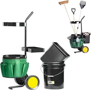 Garten- & Werkzeugtrolley I Transportwagen mit 12 & 20 L Eimer | Gerätehalter und Tasche mit 12 Fächern für Gartenwerkzeug I Gartentrolley mit Rollen I 40 kg belastbar I 100 cm Langer Griff