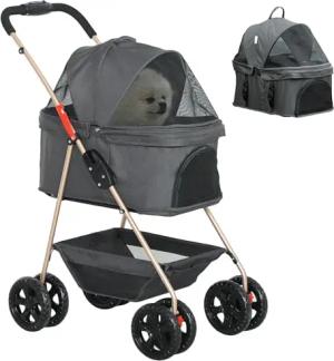 Hundewagen 3 in 1 Hundebuggy klappbar für Hunde & Katzen bis 4 kg Katzenbuggy mit Kissen Netzfenstern Getränkehalter Aufbewahrungskorb Katzenwagen Buggy Grau