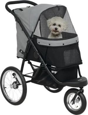Hundewagen Jogger Hundebuggy klappbar für kleine Hunde & Katzen bis 10 kg Katzenbuggy mit 3 große Gummiräder, Kissen Netzfenstern Aufbewahrungskorb Katzenwagen mit Sicherheitsleinen, Grau