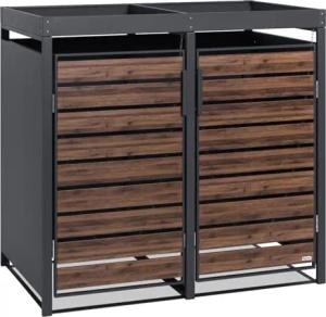 Mülltonnenbox 2 Tonnen mit Pflanzdach | (B) 132 x (T) 80 x (H) 124 cm | Anthrazit RAL 7016 | Tür in dunkelbrauner Holzoptik mit Erweiterungsmöglichkeit | Mülltonnenverkleidung
