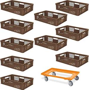 10 Eurobehälter, LxBxH 600x400x150 mm, Industriequalität, lebensmittelecht + 1 Transportroller mit Deck aus bruchsicherem ABS-Kunststoff (braun/orange)