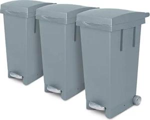 Set, 3x 80 Liter Abfallbehälter mit Rollen, grau, Fußpedal, selbstschließender Deckel, Klemmring für Müllsäcke