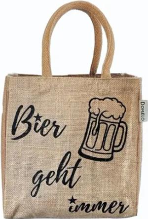Jute Flaschentasche. Geschenke für Männer. Bierträger/Flaschenträger mit Trennwänden für 6 Flaschen. kleine Einkaufskorb. Lustige witzige Bier Männerhandtasche (Natur/Bier geht immer)