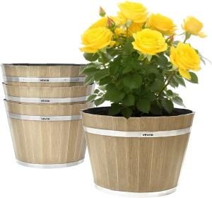 Blumentöpfe 300 x 210 mm, 4er-Pack Whiskyfass-Pflanzgefäße mit Drainagelöchern, Kunststoff-Pflanztopf im Weinfass-Design für Pflanzen im Innen- & Außenbereich, Garten, Zuhause, Braun