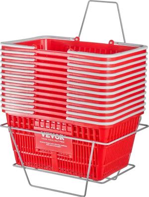 Einkaufskorb, 12er-Set, 21 l robuster Einkaufskorb aus Kunststoff mit Metallgriff und Ständer, 42 x 30 x 21 cm, tragbarer Einkaufskorb für Einzelhandelsgeschäfte, Supermärkte