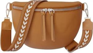 OBC Damen Tasche Crossbody Gürteltasche Brusttasche Umhängetasche Hüfttasche Crossover Bauchtasche Bodybag Schultertasche Handytasche Kunstleder Cognac
