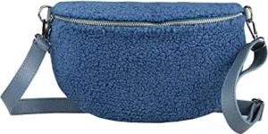 Made in Italy Damen Leder Gürteltasche Crossbody Teddyfell Bauchtasche Hüfttasche Kunstfell Plüsch Umhängetasche Brusttasche Crossover Bodybag Schultertasche Handytasche Jeansblau 30x20x7 cm
