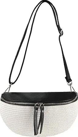 Made in Italy Damen Leder Tasche Basttasche Schultertasche Gürteltasche Sommer Strandtasche Crossbody Bauchtasche Umhängetasche Cross-Over Bodybag Handytasche Geflochten Bast Abendtasche Schwarz-Weiß