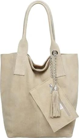 große Wildleder Shopper Schultertasche schlichte Damen Leder Handtasche mit stylischer Metallkette & kleiner Zusatztasche - CLASSIC LINE - Modell No.828 - Made in Italy, Farbe:beige