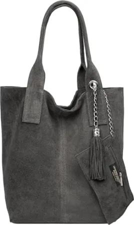 große Wildleder Shopper Schultertasche XL Damen Handtasche aus Leder mit stylischer Metallkette & kleiner Zusatztasche - CLASSIC LINE - Modell No.828 - Made in Italy, Farbe:dunkelgrau