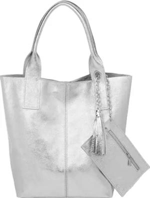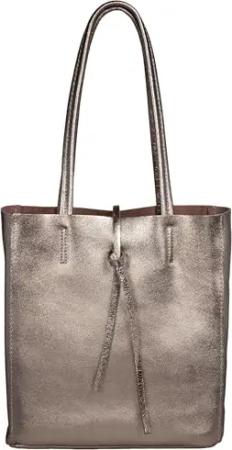 Großer Damen Leder Shopper Metallic Schultertasche mit Sicherheitsfach - CLASSIC LINE - Modell No.781 - Made in Italy, Farbe:silber metallic, Accessoires:One Size