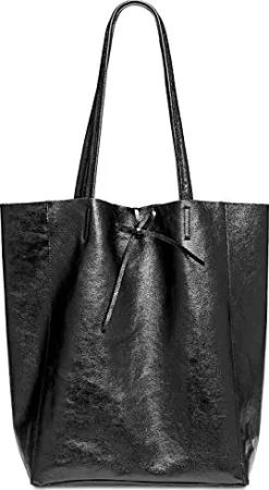 Großer Damen Leder Shopper Metallic Schultertasche mit Sicherheitsfach - CLASSIC LINE - Modell No.781 - Made in Italy, Farbe:schwarz metallic, Accessoires:One Size