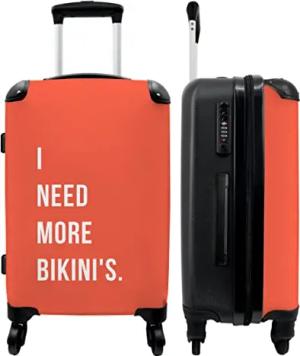 NoBoringSuitcases.com® Koffer groß Trolley Rollkoffer Reisekoffer mit 4 Rollen Fotokoffer - Ich Brauche mehr Bikinis - Zitat - Orange - 67x43x25cm - 90 Liter