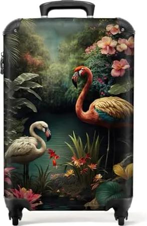 NoBoringSuitcases.com® Koffer Handgepäck Trolley Rollkoffer Kleine Reisekoffer mit 4 Rollen - Flamingo - Blumen - Dschungel - Vögel - Natur - 55x35x20cm - Fotokoffer - Kabinenkoffer - Boardgepäck