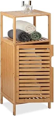 Badschrank Bambus, HBT: 87 x 36,5 x 33 cm, schmales Badregal mit Tür, 2 offene Ablagen, Badkommode, Natur