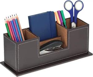 Schreibtisch Organizer, Stiftehalter mit 4 Fächern, Kunstleder, HBT: 11 x 29,5 x 11 cm, Büroorganizer, braun