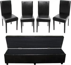 Garnitur Sitzgruppe Bank mit Aufbewahrung Kriens XXL+4 Stühle Littau, Kunstleder/Leder FSC®-zertifiziert ~ schwarz