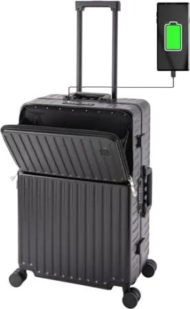 Roma Reisekoffer mit USB & Getränkehalter, Hartschale, Alu-Rahmen, Extrafach, 2xTSA, 65x40x25 cm, schwarz