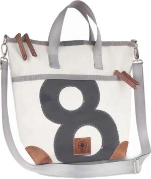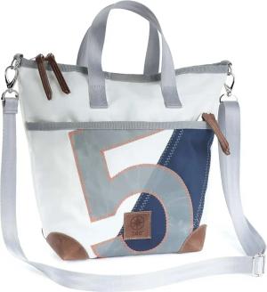 Taschen Deern Mini Schultertasche weiß / blau, Zahl hellgrau, Gurt grau mit Karabinern