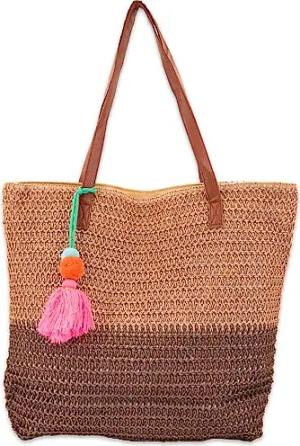 Damen Bast Strandtasche 45 x 13 x 46 cm mit Reißverschluss | Zweifarbige Korbtasche mit Quaste | Flechttasche mit langen Henkeln für Strand & Shopping, Farbe:Braun-Dunkelbraun