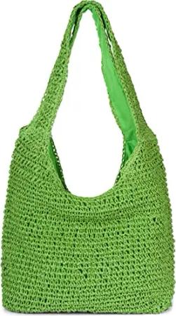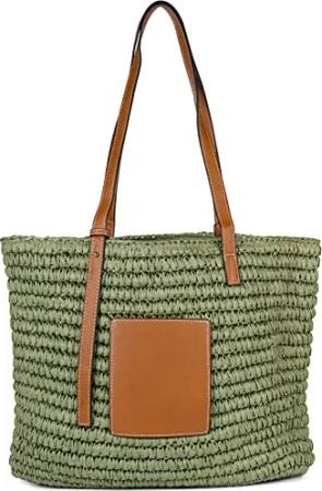 Damen Papierstroh Beuteltasche mit langen Henkeln | sommerliche Flechttasche mit Reißverschluss | Strandtasche Schultertasche, Farbe:Grün