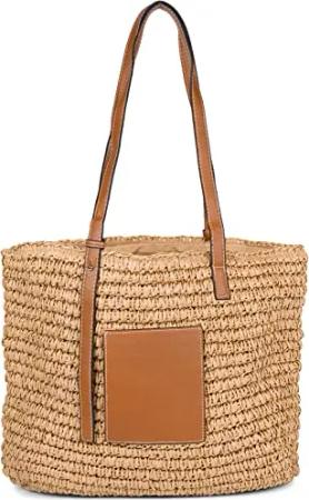 Korbflecht Schultertasche aus Papierstroh mit Kunstleder Details | Damen Shopper Basttasche geflochten mit Reißverschluss | Strandtasche 43 x 34 x 4 cm, Farbe:Braun
