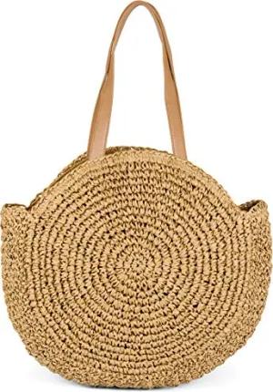 runde Damen Basttasche mit langen Henkeln | Geflochtene Korbtasche als Strandtasche oder Shopper | Großes Hauptfach mit Reißverschluss, Farbe:Braun