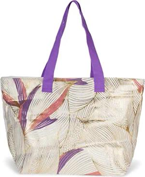 XXL Strandtasche mit Palmen Blätter Print in Metallic Optik | Tropischer Shopper mit Reißverschluss & Stoffhenkel | Damen Schultertasche 56 x 36 x 17 cm, Farbe:Violett-Mauve