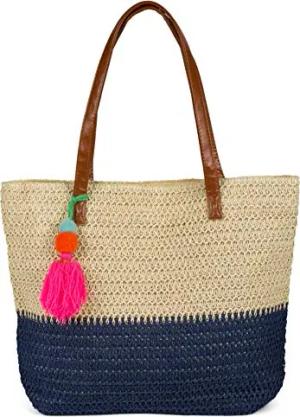 Damen Bast Strandtasche 45 x 13 x 46 cm mit Reißverschluss | Zweifarbige Korbtasche mit Quaste | Flechttasche mit langen Henkeln für Strand & Shopping, Farbe:Beige-Dunkelblau