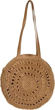 Damen Runde Schultertasche aus geflochtenem Papierstroh, Henkeltasche, Reißverschluss, Boho Style 02012383, Farbe:Braun