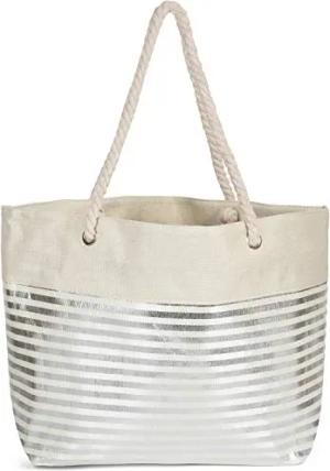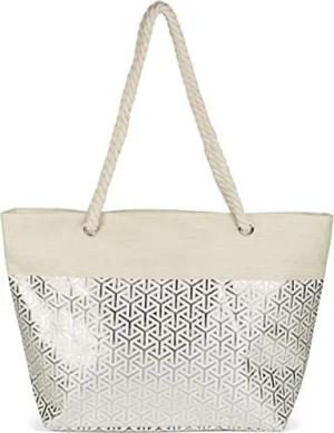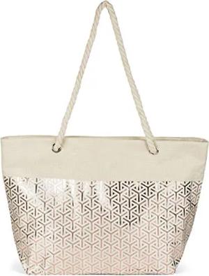 Damen XXL Strandtasche mit Reißverschluss und Metallic Glitzer Streifen | große Badetasche für Familie oder Shopping | 58 x 38 x 20 cm, Farbe:Beige-Silber