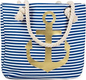 gestreifte Strandtasche mit Anker Print | maritimer Shopper mit Kordelgriffen | Badetasche groß 46 x 34 x 12 cm, Farbe:Blau-Weiß/Gold