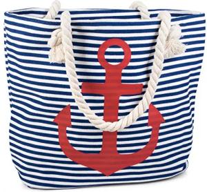 gestreifte Strandtasche mit Anker Print | maritimer Shopper mit Kordelgriffen | Badetasche groß 46 x 34 x 12 cm, Farbe:Blau-Weiß/Rot