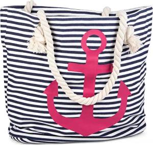 gestreifte Strandtasche mit Anker Print | maritimer Shopper mit Kordelgriffen | Badetasche groß 46 x 34 x 12 cm, Farbe:Marine-Weiß/Pink