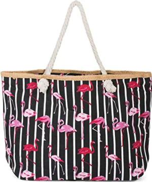 Große Strandtasche mit Flamingo Print und Streifen Design | Damen Shopper mit Kordelhenkel und Reißverschluss | Badetasche mit Bast-Detail | 58 x 37 x 13 cm, Farbe:Schwarz-Weiß