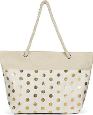 Große Strandtasche mit Metallic Punkte Print | Damen Shopper mit Kordelhenkel und Reißverschluss | Badetasche im Boho Look | 56 x 38 x 17 cm, Farbe:Beige-Gold