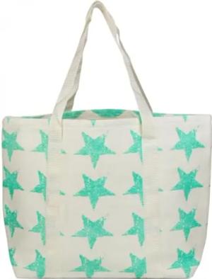 große XXL Strandtasche mit Vintage Sterne Muster | Reißverschluss | Familien Badetasche Shopper 54 x 36 x 25 cm, Farbe:Creme-Mint