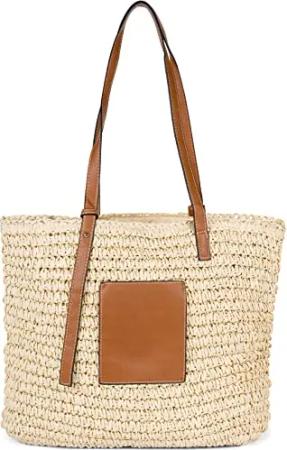 Korbflecht Schultertasche aus Papierstroh mit Kunstleder Details | Damen Shopper Basttasche geflochten mit Reißverschluss | Strandtasche 43 x 34 x 4 cm, Farbe:Braun