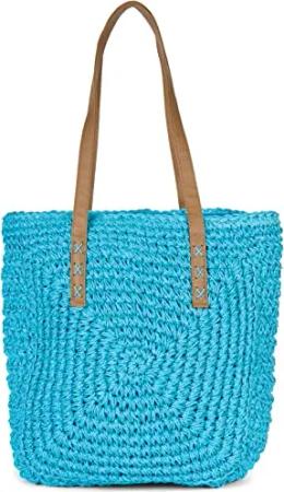 Papierstroh Schultertasche mit langen Henkeln | Damen Basttasche Korbtasche geflochten mit Reißverschluss | Boho Shopper Sommertasche 40 x 40 x 5 cm, Farbe:Türkis